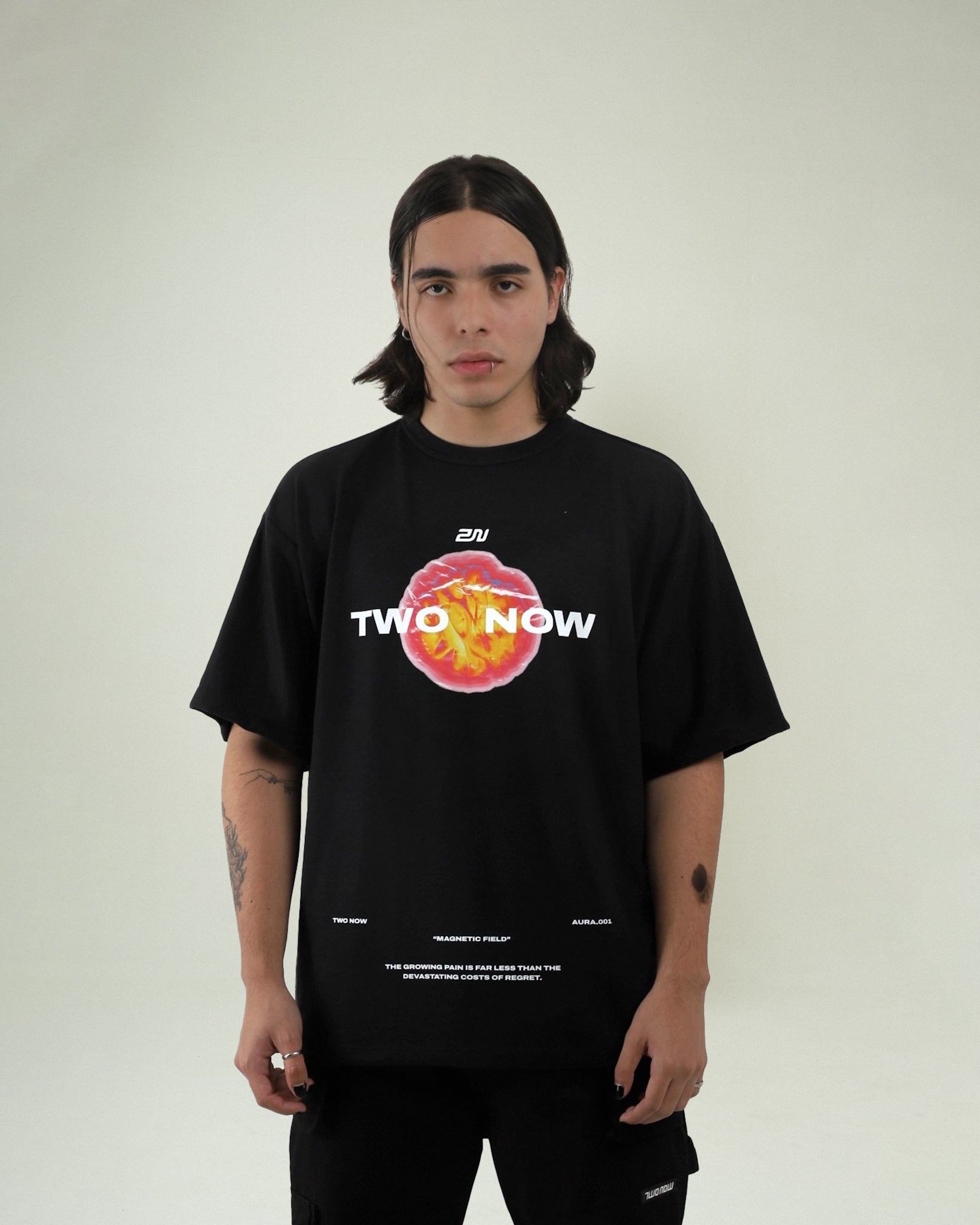 Camiseta unisex negra confeccionada en algodón 100% orgánico. Corte oversized para mayor comodidad. Adelante en el centro tiene un gráfico estampado de nuestra coleccion Aura.
